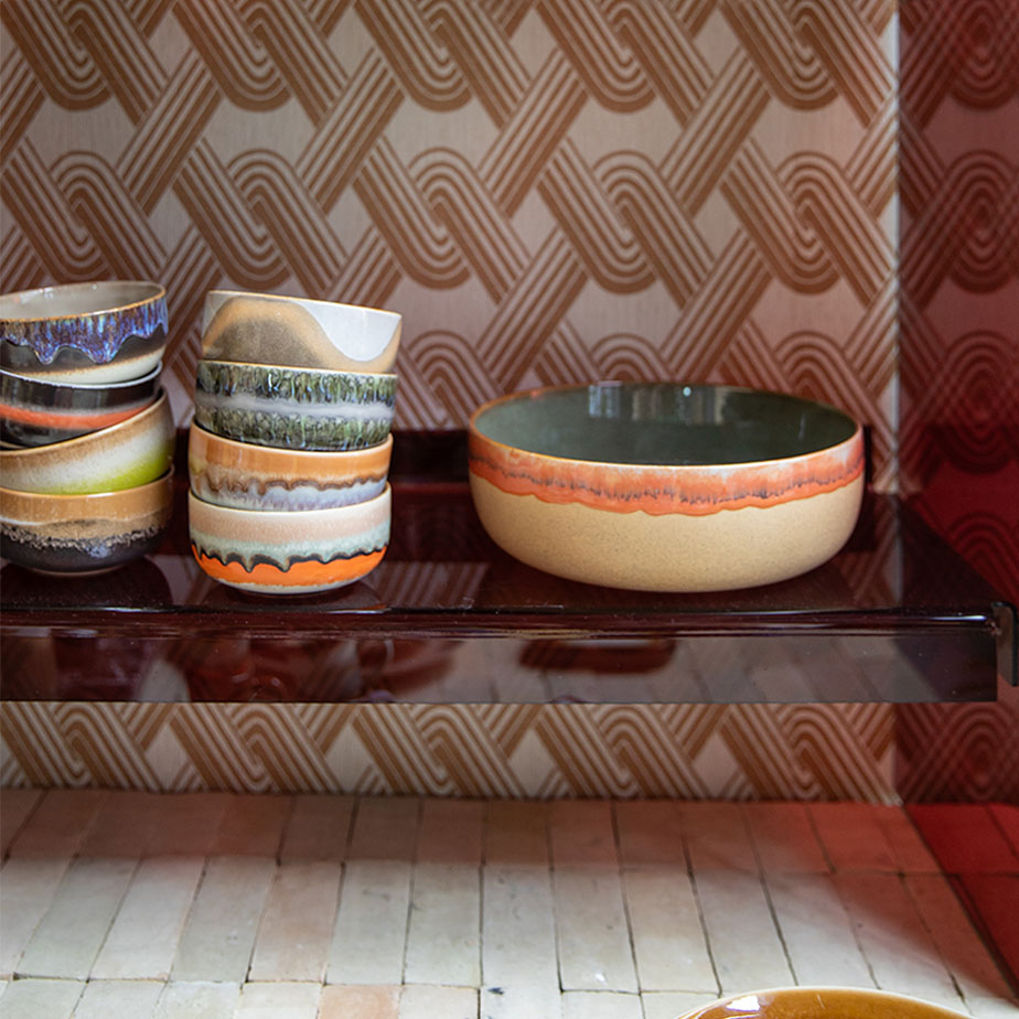 קערת סלט גדולה בסגנון רטרו מסדרת 70S CERAMICS של המותג ההולנדי HK LIVING, הקערה עשויה מקרמיקה בזיגוג ריאקטיבי, שהופך כל פריט ליחיד במינו.