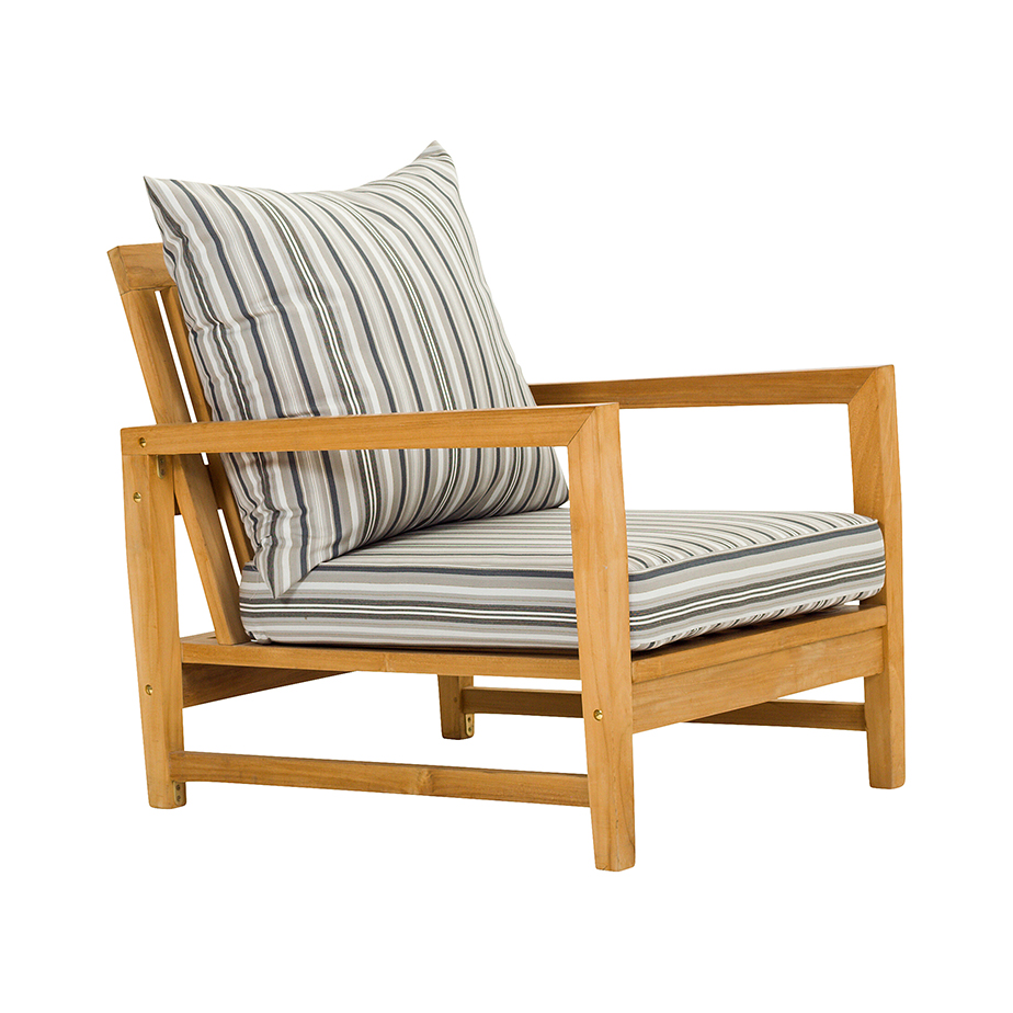 כורסא רחבה ומזמינה, מתוך מערכת הישיבה AMALFI לסביבת החוץ למרפסת ולגינה. הכורסה המעוצבת עשויה מעץ טיק, בשילוב כריות מרופדות מבד דריילון משובח העמיד לכל תנאי מזג האוויר. הבד מאריך ימים, אינו דוהה, אטום למים ונעים מאד למגע. לבחירתכם מבחר גוונים והדפסים לריפוד.