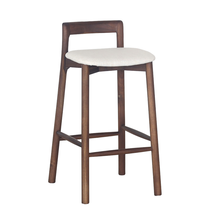 כסא בר מעץ בצבע אגוז, בעל משענת נמוכה ומושב בד אקרילי מחוספס. יכניס טאץ’ סקנדינבי בכל חלל מעוצב.