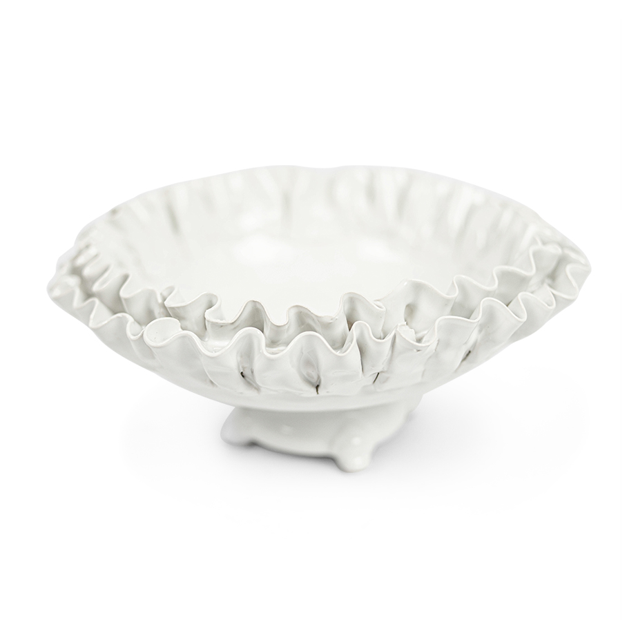 קערת הקרמיקה Claudine של המותג השוודי OLSSON & JENSEN מתאפיינת בשוליים גליים כפולים שמזכירים קפל קישוטי בבד, כמו צווארון ראף מהאופנה של ימי הביניים. הגימור המדורג והצורה הא־סימטרית מעניקים לה מראה רך ומחוספס, שמדגיש את האופי הייחודי של עבודת היד.