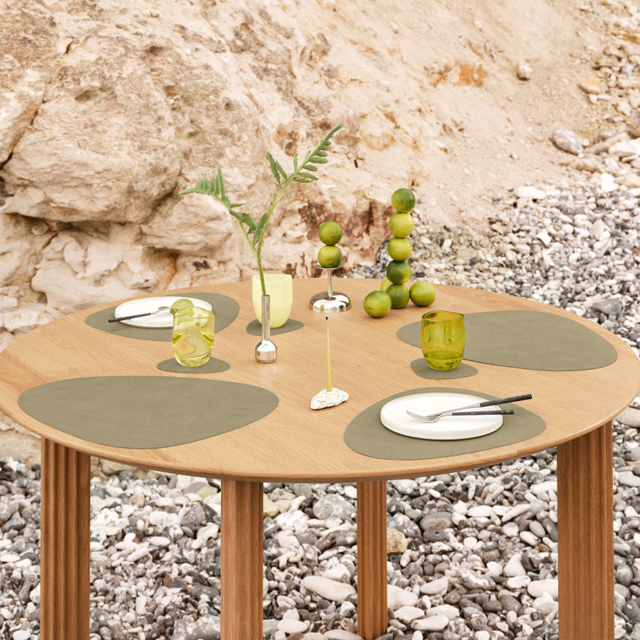 פלייסמט Curve של המותג LIND DNA מיוצר מעור ממוחזר, משילוב של שאריות עור מתעשיית הרהיטים עם 20% גומי טבעי, ליצירת חומר עמיד וקל לניקוי. עיצובו האורגני והמעוגל מוסיף תחושה של זרימה בשולחן האוכל, והוא זמין במבחר גוונים וטקסטורות. הפלייסמט מיוצר בעבודת יד בדנמרק, תוך דגש על קיימות ואיכות גבוהה.