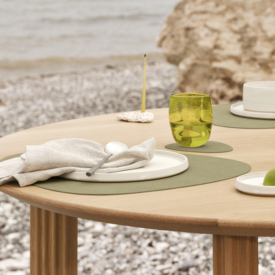 פלייסמט Curve של המותג LIND DNA מיוצר מעור ממוחזר, משילוב של שאריות עור מתעשיית הרהיטים עם 20% גומי טבעי, ליצירת חומר עמיד וקל לניקוי. עיצובו האורגני והמעוגל מוסיף תחושה של זרימה בשולחן האוכל, והוא זמין במבחר גוונים וטקסטורות. הפלייסמט מיוצר בעבודת יד בדנמרק, תוך דגש על קיימות ואיכות גבוהה.