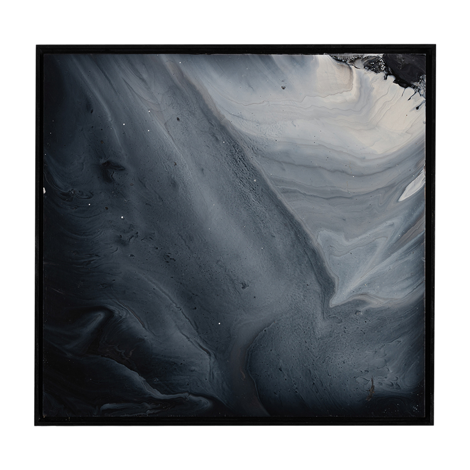 מתוך סדרה של דנה הראל שנוצרה בתהליך של ציור פעולה באמצעות צבעי שמן תעשייתיים, זפת ומדללים סינתטיים, חומרים שנפלטו מתעשיית הבניין ועוברים שימוש חוזר. החומר נשפך ומוטה על הקנבס מתוך ויתור מכוון על שליטה, ומאפשר לזרימה ולמשקל לפעול מעצמם. הדימויים שנוצרים מאזכרים תצורות טבעיות של אדמה, סלע ותנועת מים, ונושאים חותם של תנועה וזמן, בהשפעת טכניקות יפניות מסורתיות.