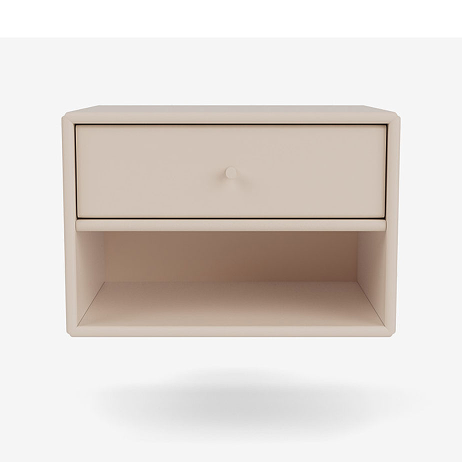 יחידת מדפים מדגם DASH של מותג הלייפסטייל מדנמרק MONTANA. יחידת אכסון קטנה בעיצובו של Peter J. Lassen, הכוללת שולחן, מדף ומגירה, בצבע חול קרם. השידה מגיעה עם מסילה שמאפשרת את הבחירה האם להניח אותה על הרצפה או לתלות על הקיר. פתרון אחסון אידיאלי לחדר השינה או פריט אחסון בכניסה הביתה.