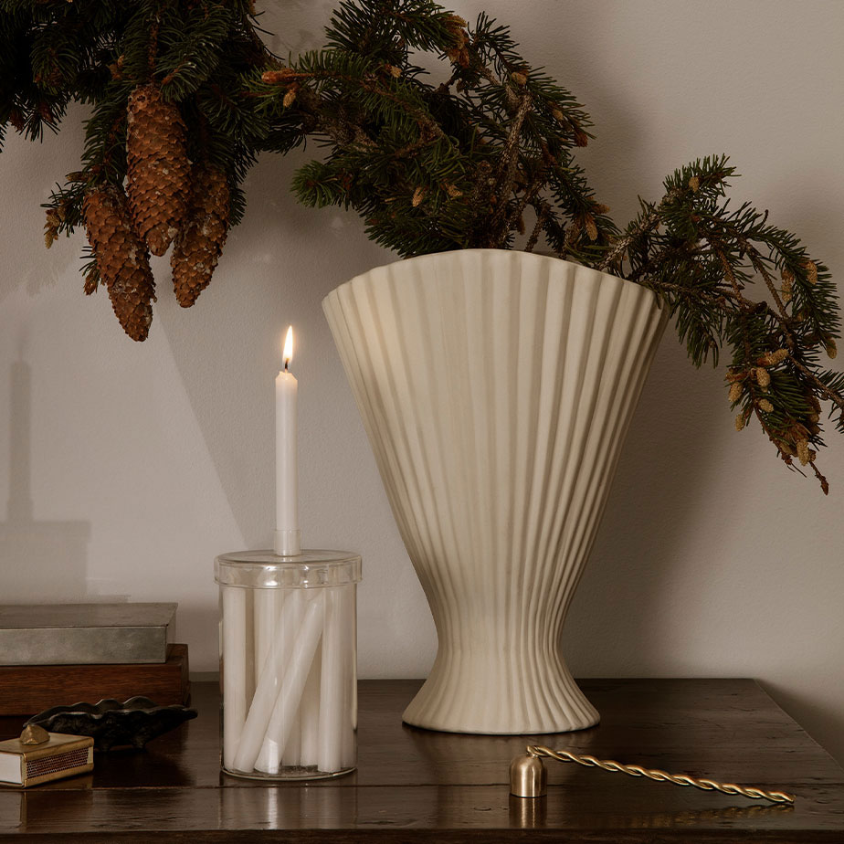 אגרטל גבוה FOUNTAIN. של המותג הדני FERM LIVING. מעוצבת כמזרקה פיסולית מוגבהת, במראה רך ורומנטי. עם גימור מט חיצוני, וגימור מבריק מבפנים. לסידורי פרחים מרשימים או כאביזר עיצובי.
