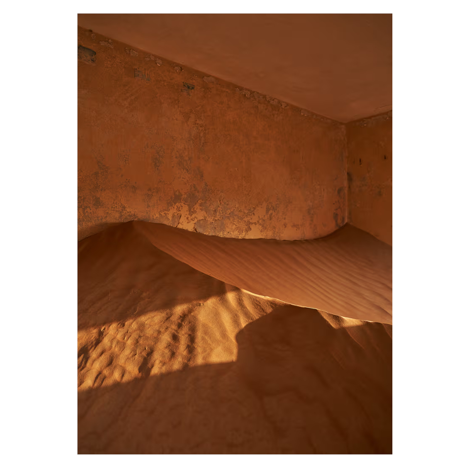 הפוסטר Sand Village II של הצלם הצרפתי Stan Desjeux, מתוך האוסף של המותג הדני PAPER COLLECTIVE, מתעד רגע שבו המדבר חודר פנימה. קרני שמש רכות מאירות חדר כמעט ריק, שהחול כבר מילא את רצפתו וטיפס לאט גם על הקירות.