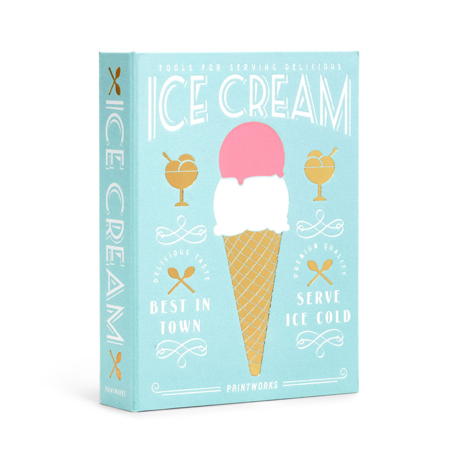 ערכת גלידה מסדרת The Essential של המותג השוודי הצעיר PRINTWORKS, שמעוצבת ככריכה מהודרת של ספר, ומכילה את כל הכלים הנחוצים למסיבת גלידה מושלמת. בפנים תמצאו כף להגשת גלידה ושני קונוסים מנירוסטה, ושתי כפות עץ לפיזור סוכריות. כלי הנירוסטה בטוחים לשטיפה במדיח.