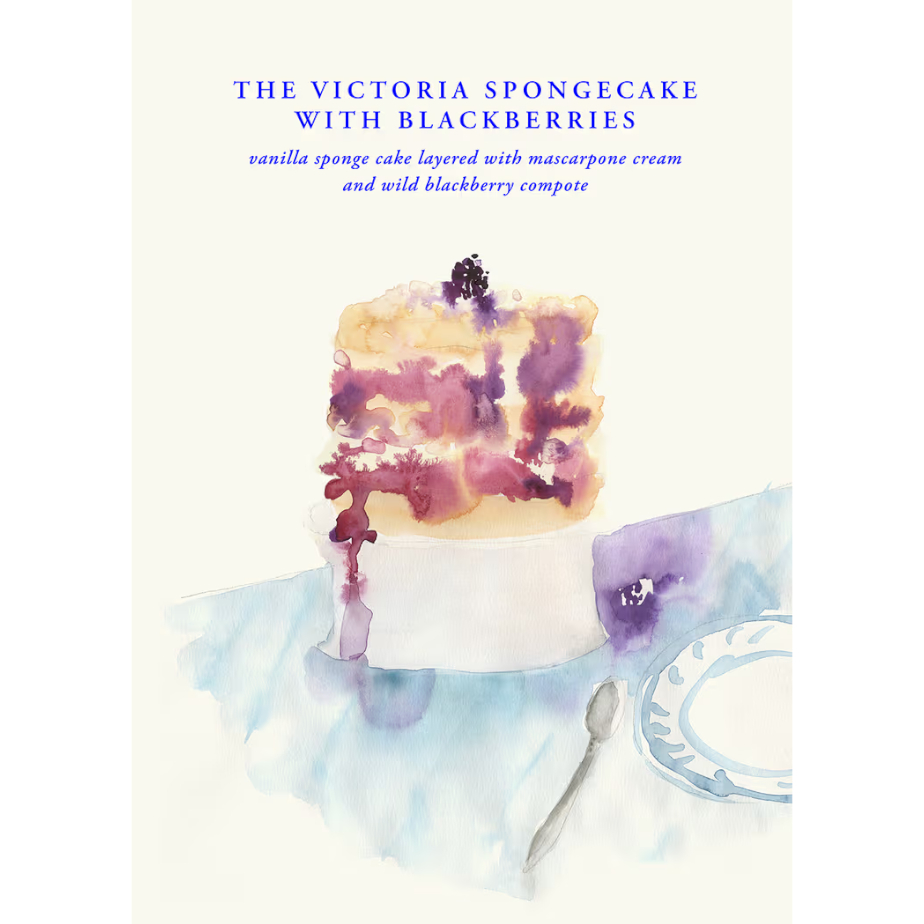 הפוסטר The Victoria Spongecake של סטודיו All The Way To Paris, מתוך האוסף של המותג הדני PAPER COLLECTIVE, נוצר במקור כחלק מלוח השנה שלהם לשנת 2026 – A Year of Greens, מחווה לתגליות מהגינה לאורך עונות השנה. בצבעי מים עשירים ובעיפרון רך, מוצג כאן קינוח קלאסי שמורכב משכבות רכות של עוגת ספוג, קצפת ופירות יער בגוונים של כחול וסגול.