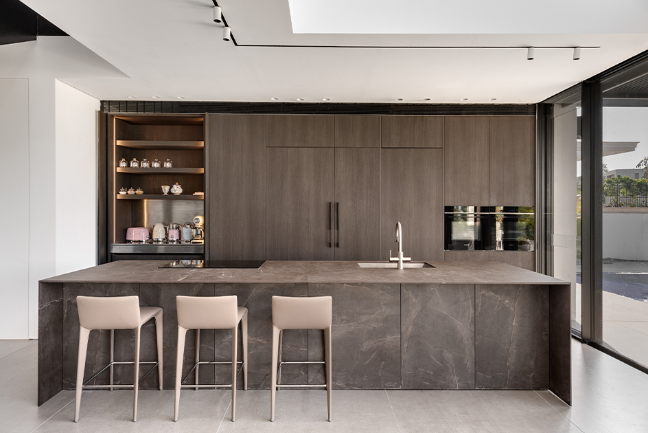 הבית מעוצב בסגנון מודרני כשהחומריות הבולטת בו מתבססת על עץ בגוון טבעי וכהה, רצפה בגוון בהיר ניטרלי ופריטי ריהוט בהירים.