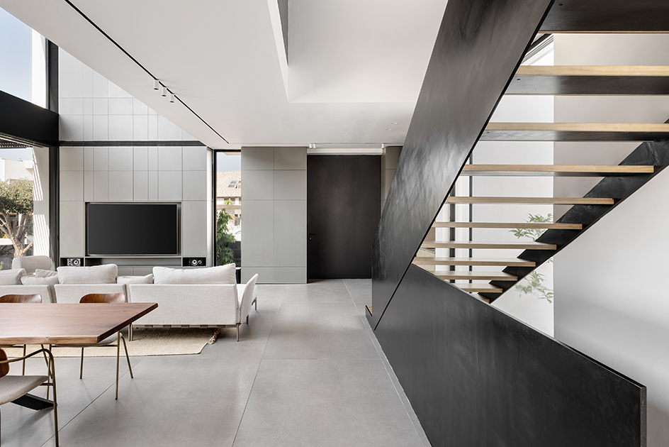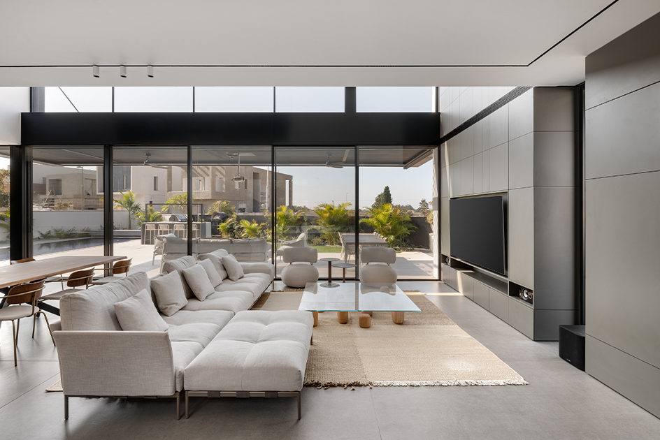 בני הזוג אוהבים לארח ובתכנון הבית היה “חשוב להם לארח ולשמור על כל הפונקציות התפעוליות באזורים שאינם גלויים לעין וכן מקומות טכניים נסתרים”. אזור האירוח מאופיין בתקרה גבוהה לעומת חדרי השינה שהם נמוכים יותר.